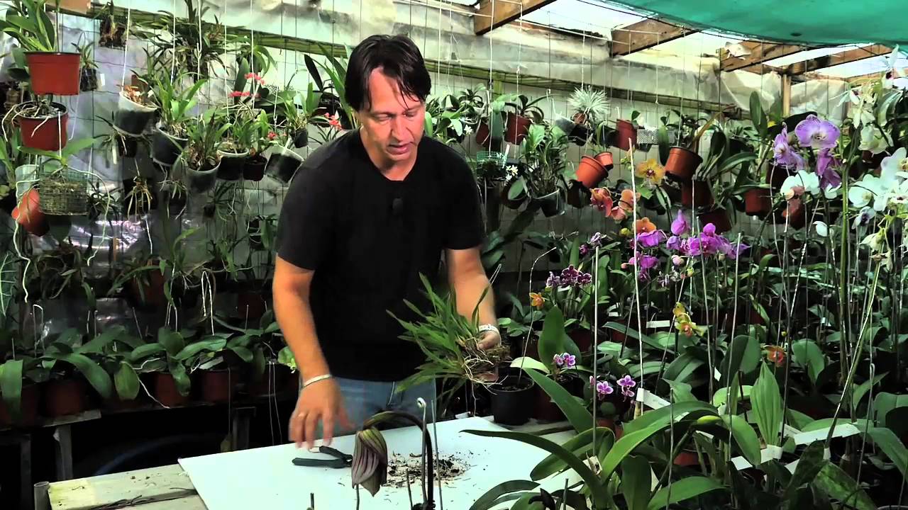 Sortez la motte du pot en tenant la plante vers le bas en tapotant le bord sur pot sur le rebord de la table de rempotage. Une plante mature a des feuilles en forme de sangle poussant en.