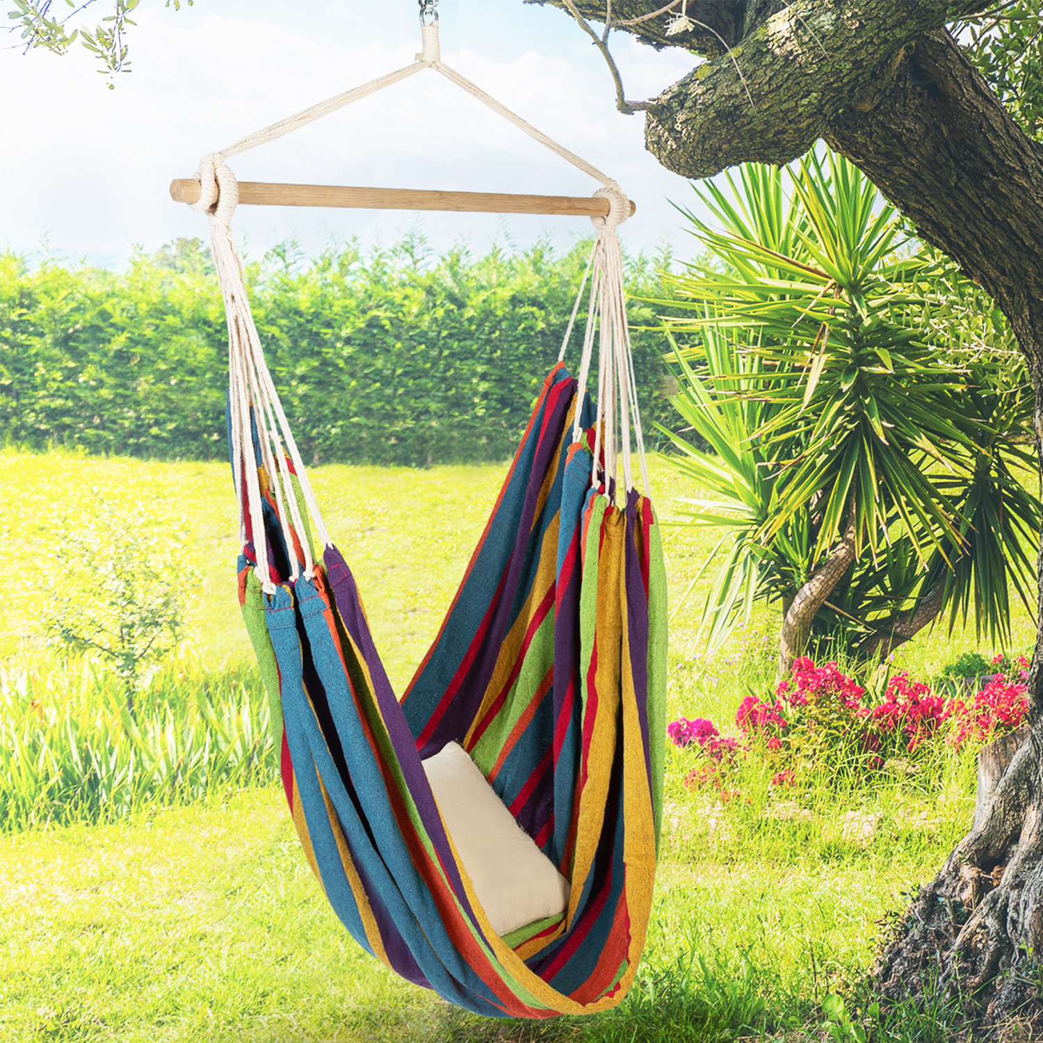 Hamac Suspendu Hamac siège suspendu avec toile rayée multicolores. Il est livré avec 2. Pas cher et facile à installer, le hamac à suspendre. Confort et charme rythment ces siestes suspendues.